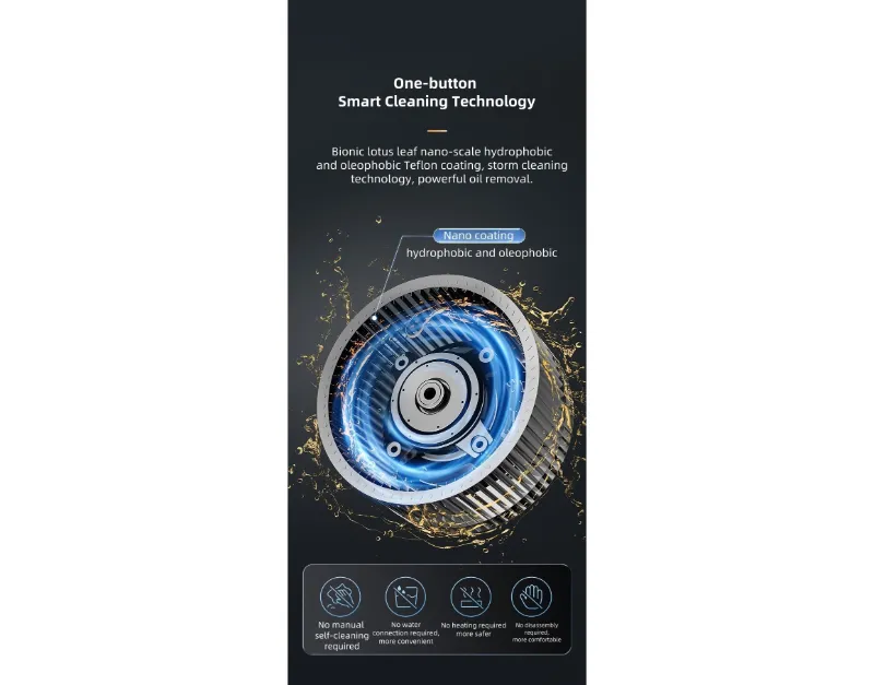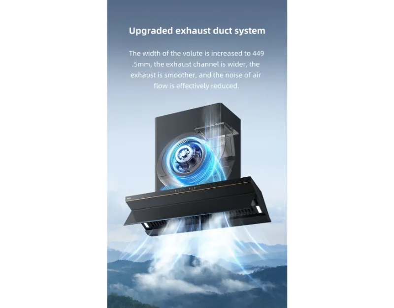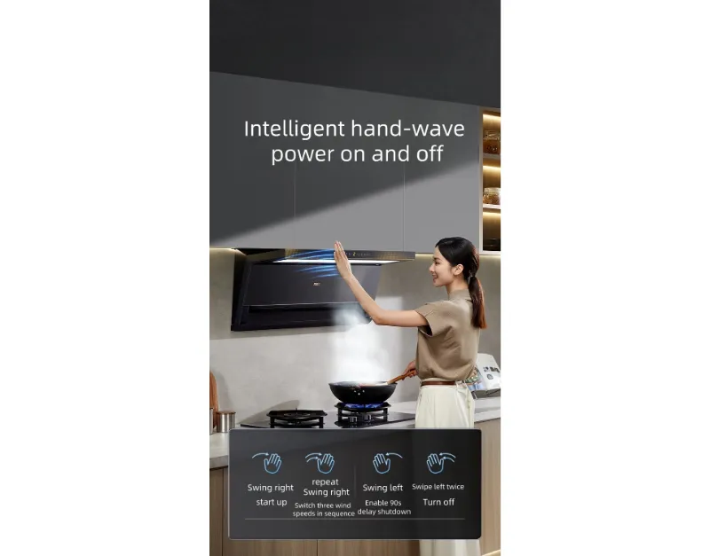 يتميز شفاط المطبخ بتصميم شفط علوي + جانبي لالتقاط الدخان بكفاءة ، في حين أن المكره المطلي بالنانو يتيح التنظيف الذاتي الذكي لأداء طويل الأمد. تعمل وظيفة التحكم في التطواف على ضبط تدفق الهواء تلقائيا للحصول على تهوية مثالية. ترفع اللوحة الزجاجية الأمامية بسهولة للوصول المريح.
