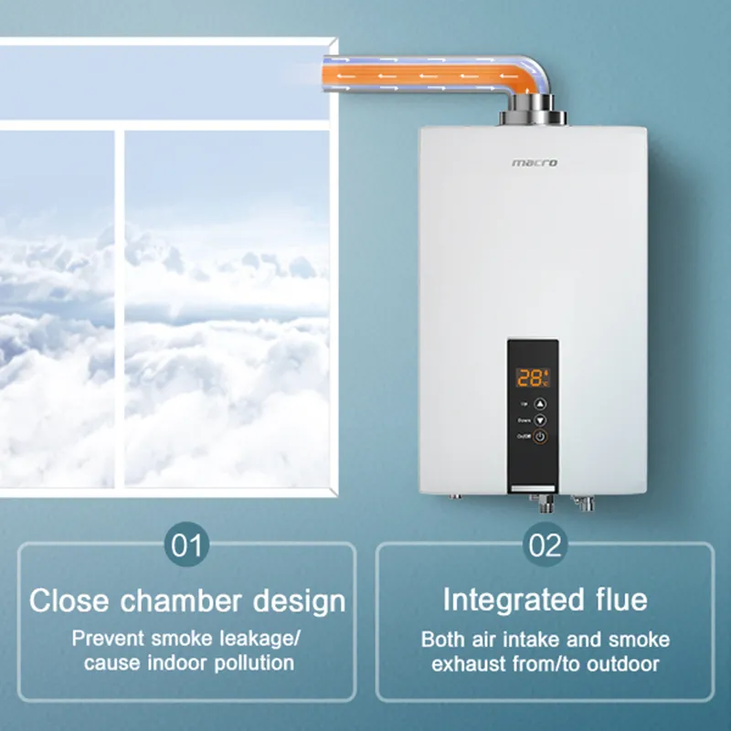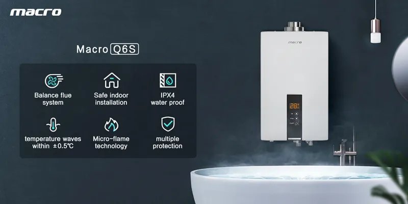 يتوفر نوع مدخنة توازن كيو 6 إس ليتم تثبيته داخل الغرفة ، والذي يعتمد نظام التحكم الرقمي الذكي مع تقنية العاكس المتقدمة ، وتحقيق التكيف الذاتي الذكي لتثبيت درجة الحرارة ، وتقديم أفضل تجربة للمياه الساخنة.