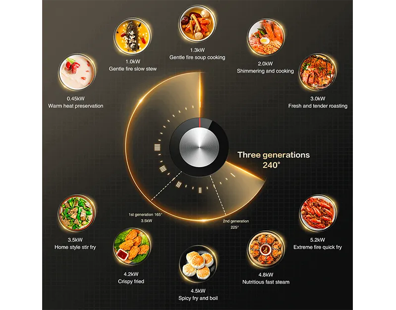 زيادة نطاق قابل للتعديل من 75° لتحقيق ضبط دقيق من 0.45-5.2 كيلو واط. المهنية مستوى الشيف نجمة دقيقة السيطرة على الحرائق ، وصفات مختلفة يمكن طهي في الإرادة.