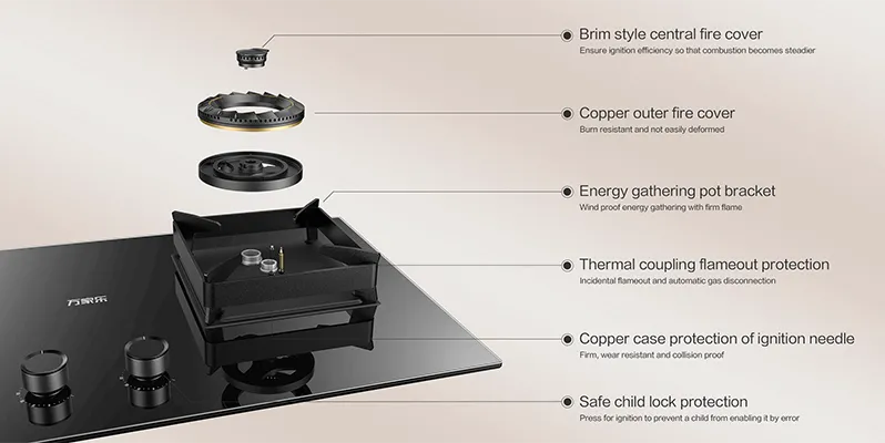 يجمع موقد الغاز هذا بين التصميم المتميز والوظائف لتجارب الطهي المرتفعة. يتميز بغطاء موقد نحاسي وموقد من النوع إكس مع غطاء حريق سلم حلزوني مزخرف مذهب ، ويضمن توزيعا متساويا للحرارة ويضيف لمسة من الأناقة. يوفر دعم المقلاة الفولاذية المينا مقاومة متينة وعالية الحرارة لوضع أواني الطهي المستقرة. يتم تعزيز السلامة والراحة من خلال دبوس الإشعال ذو الغلاف النحاسي وتعديل عريض 240 دولارا للتحكم الدقيق في اللهب ، بالإضافة إلى وظيفة توقيت 0-180 دقيقة للطهي بدون استخدام اليدين. بفضل الحمل الحراري القوي بقدرة 5.0 كيلو وات وهيكل الموقد القابل للفصل لسهولة التنظيف ، يوازن هذا الموقد بين القوة والأناقة والتطبيق العملي لاستخدام المطبخ متعدد الاستخدامات.