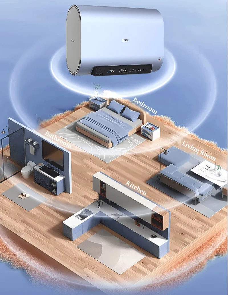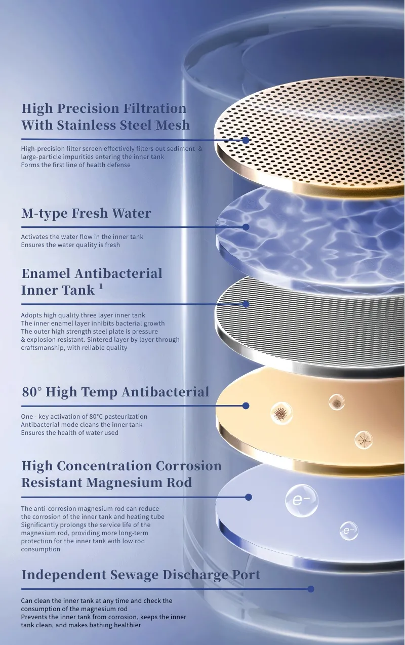 التحكم الذكي في متناول يدك مع اتصال واي فاي ولوحة حساسة للمس ، مما يسمح بتعديل درجة الحرارة عن بعد (30-75 C ج) ، والجدولة ، والمراقبة في الوقت الفعلي عبر الهاتف الذكي. يضمن نظام التنقية المكون من 6 مراحل مياه أنظف ، ويجمع بين قضيب مغنيسيوم عالي النقاء ، وخزان داخلي مطلي بالمينا 3 د ، وتعقيم بدرجة حرارة عالية (99 ٪ مضاد للبكتيريا) ، وتصميم تدفق مياه على شكل م لتقليل تراكم الرواسب. منفذ تصريف مستقل يبسط الصيانة.