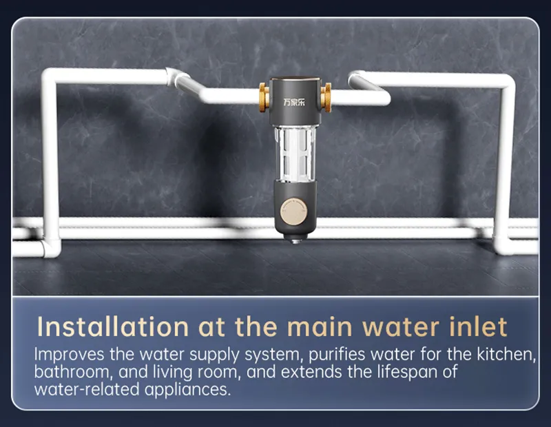 يمكن تركيبها على خط المياه الرئيسي لترشيح المنزل بالكامل أو بشكل مستقل في الواجهة الأمامية للأجهزة التي تستخدم المياه للتنقية المستهدفة.
